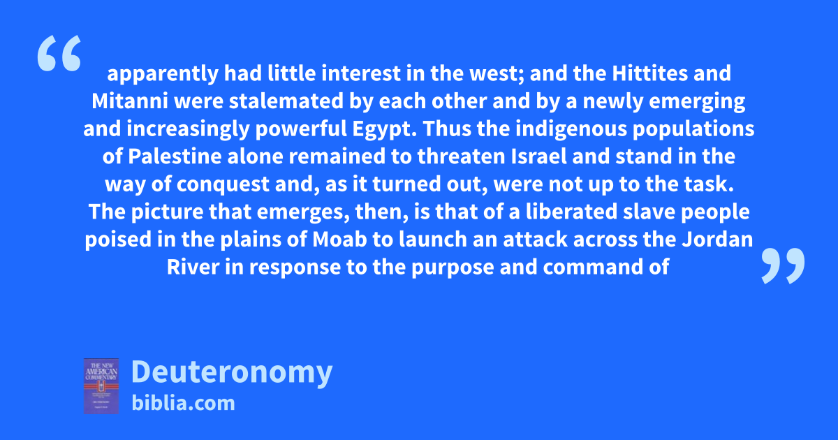 apparently had little interest in the west; and the Hittites and Mitanni were stalemated by each other and by a newly emerging and increasingly powerful Egypt. Thus the indigenous populations of Palestine alone remained to threaten Israel and stand in the way of conquest and, as it turned out, were not up to the task. The picture that emerges, then, is that of a liberated slave people poised in the plains of Moab to launch an attack across the Jordan River in response to the purpose and command of
