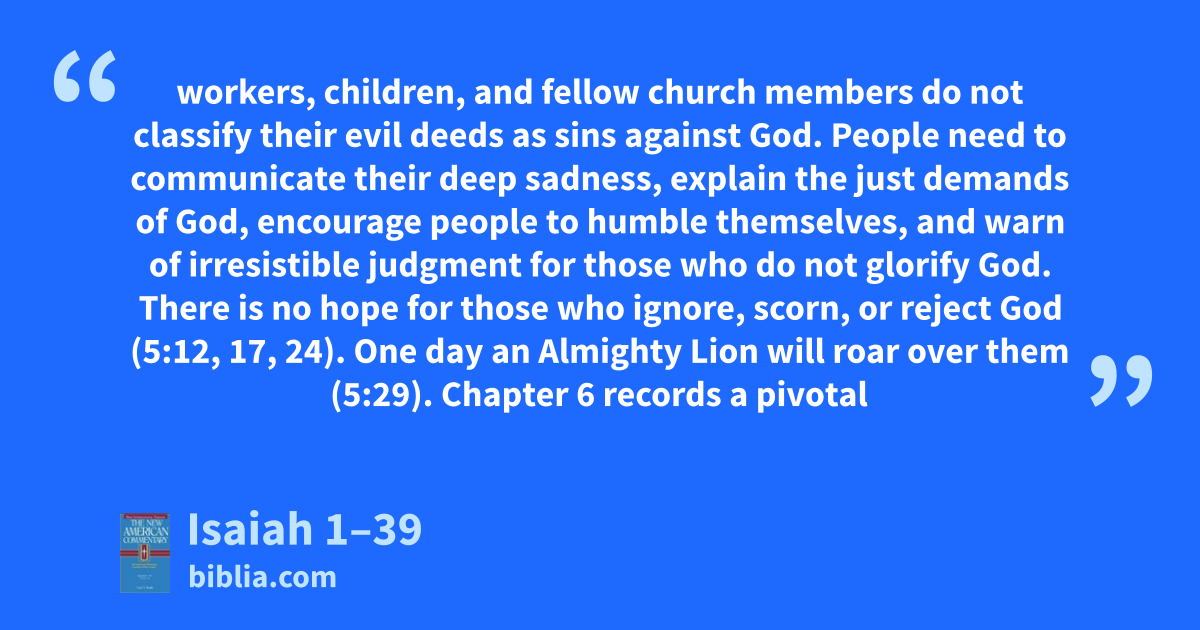 workers, children, and fellow church members do not classify their evil deeds as sins against God. People need to communicate their deep sadness, explain the just demands of God, encourage people to humble themselves, and warn of irresistible judgment for those who do not glorify God. There is no hope for those who ignore, scorn, or reject God (5:12, 17, 24). One day an Almighty Lion will roar over them (5:29). Chapter 6 records a pivotal