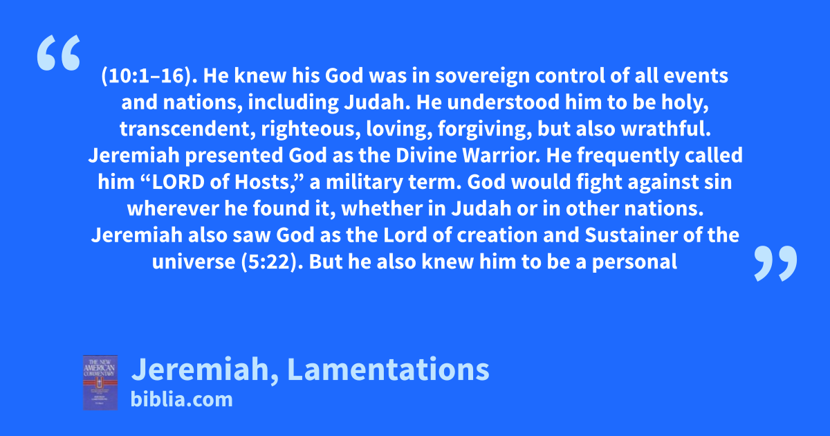 (10:1–16). He knew his God was in sovereign control of all events and nations, including Judah. He understood him to be holy, transcendent, righteous, loving, forgiving, but also wrathful. Jeremiah presented God as the Divine Warrior. He frequently called him “LORD of Hosts,” a military term. God would fight against sin wherever he found it, whether in Judah or in other nations. Jeremiah also saw God as the Lord of creation and Sustainer of the universe (5:22). But he also knew him to be a personal