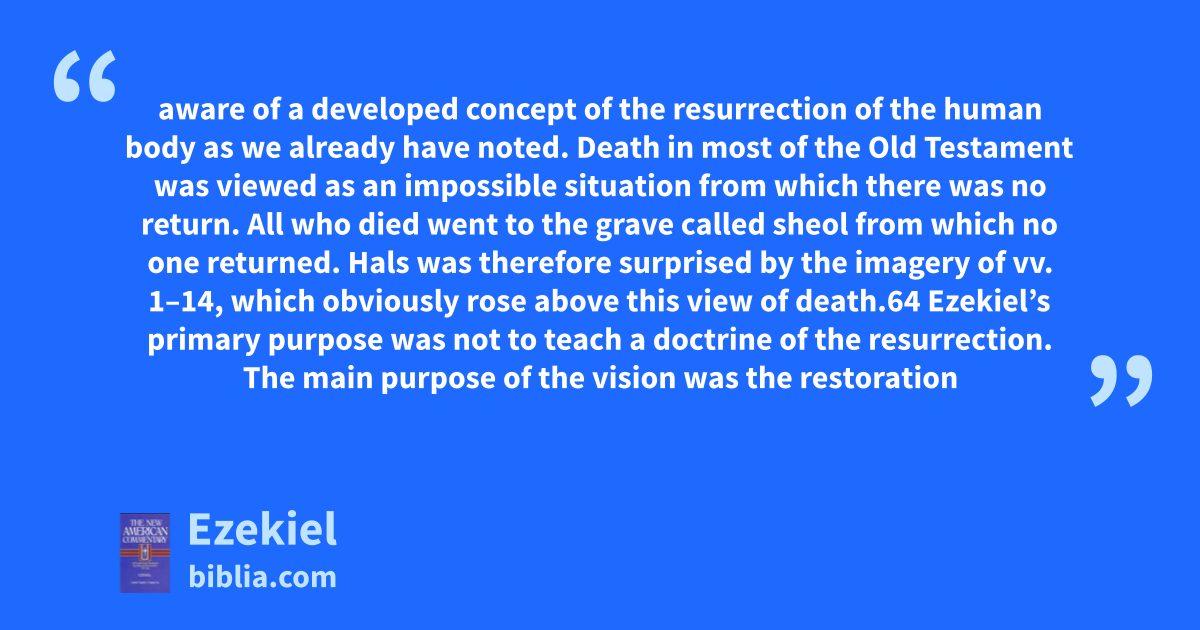 aware of a developed concept of the resurrection of the human body as we already have noted. Death in most of the Old Testament was viewed as an impossible situation from which there was no return. All who died went to the grave called sheol from which no one returned. Hals was therefore surprised by the imagery of vv. 1–14, which obviously rose above this view of death.64 Ezekiel’s primary purpose was not to teach a doctrine of the resurrection. The main purpose of the vision was the restoration