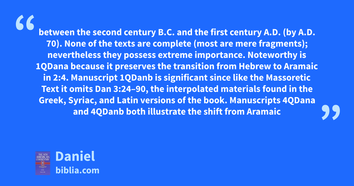 between the second century B.C. and the first century A.D. (by A.D. 70). None of the texts are complete (most are mere fragments); nevertheless they possess extreme importance. Noteworthy is 1QDana because it preserves the transition from Hebrew to Aramaic in 2:4. Manuscript 1QDanb is significant since like the Massoretic Text it omits Dan 3:24–90, the interpolated materials found in the Greek, Syriac, and Latin versions of the book. Manuscripts 4QDana and 4QDanb both illustrate the shift from Aramaic