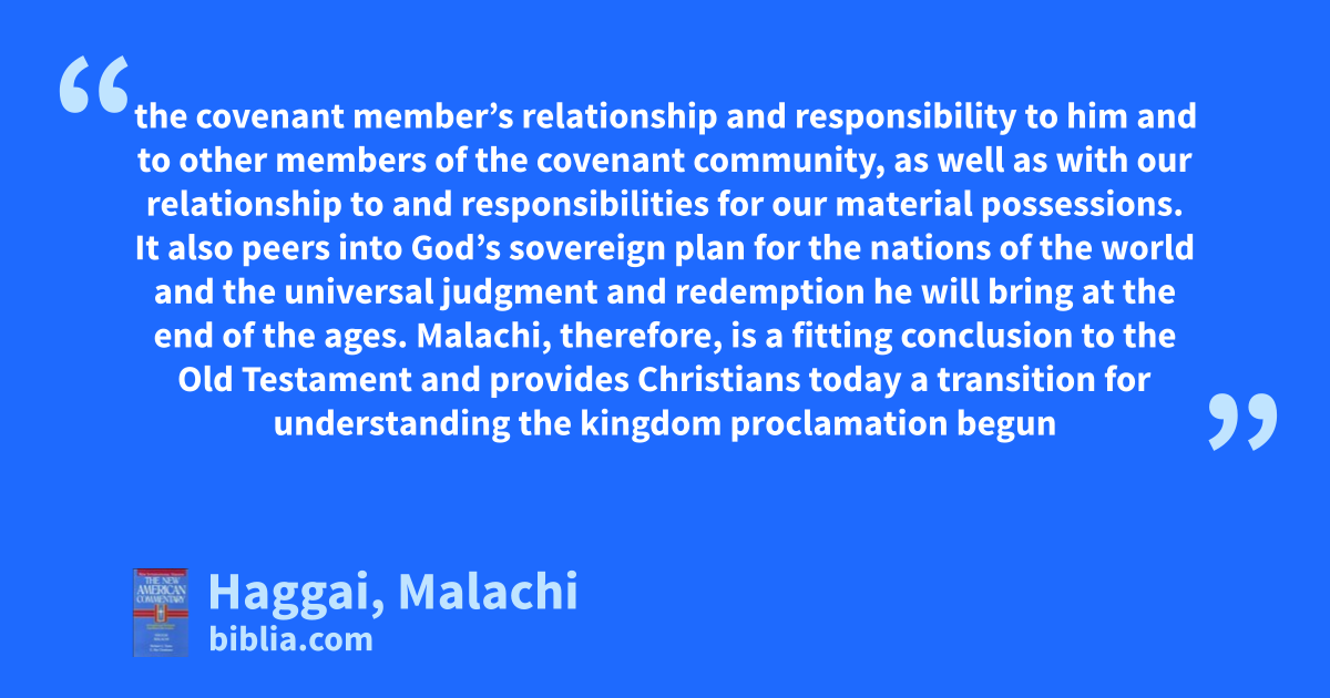 the covenant member’s relationship and responsibility to him and to other members of the covenant community, as well as with our relationship to and responsibilities for our material possessions. It also peers into God’s sovereign plan for the nations of the world and the universal judgment and redemption he will bring at the end of the ages. Malachi, therefore, is a fitting conclusion to the Old Testament and provides Christians today a transition for understanding the kingdom proclamation begun