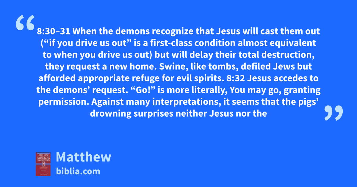 8:30–31 When the demons recognize that Jesus will cast them out (“if you drive us out” is a first-class condition almost equivalent to when you drive us out) but will delay their total destruction, they request a new home. Swine, like tombs, defiled Jews but afforded appropriate refuge for evil spirits. 8:32 Jesus accedes to the demons’ request. “Go!” is more literally, You may go, granting permission. Against many interpretations, it seems that the pigs’ drowning surprises neither Jesus nor the