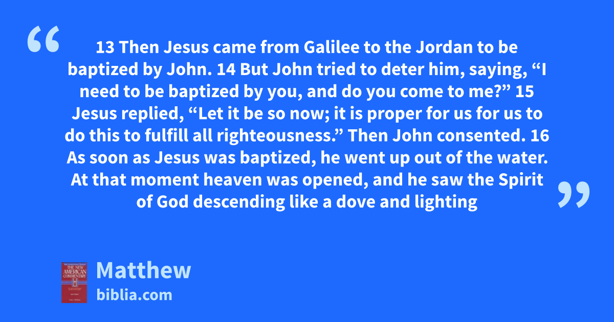 13 Then Jesus came from Galilee to the Jordan to be baptized by John. 14 But John tried to deter him, saying, “I need to be baptized by you, and do you come to me?” 15 Jesus replied, “Let it be so now; it is proper for us for us to do this to fulfill all righteousness.” Then John consented. 16 As soon as Jesus was baptized, he went up out of the water. At that moment heaven was opened, and he saw the Spirit of God descending like a dove and lighting