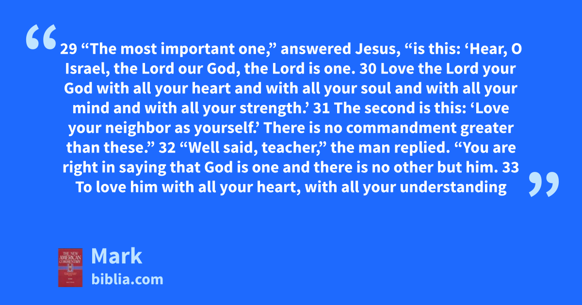 29 “The most important one,” answered Jesus, “is this: ‘Hear, O Israel, the Lord our God, the Lord is one. 30 Love the Lord your God with all your heart and with all your soul and with all your mind and with all your strength.’ 31 The second is this: ‘Love your neighbor as yourself.’ There is no commandment greater than these.” 32 “Well said, teacher,” the man replied. “You are right in saying that God is one and there is no other but him. 33 To love him with all your heart, with all your understanding