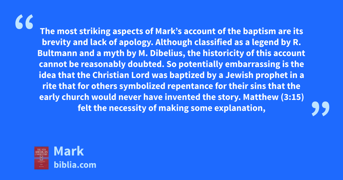 The most striking aspects of Mark’s account of the baptism are its brevity and lack of apology. Although classified as a legend by R. Bultmann and a myth by M. Dibelius, the historicity of this account cannot be reasonably doubted. So potentially embarrassing is the idea that the Christian Lord was baptized by a Jewish prophet in a rite that for others symbolized repentance for their sins that the early church would never have invented the story. Matthew (3:15) felt the necessity of making some explanation,
