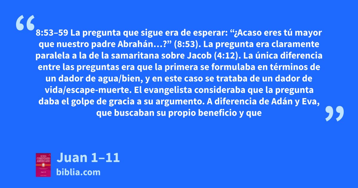 8:53–59 La pregunta que sigue era de esperar: “¿Acaso eres tú mayor que nuestro padre Abrahán…?” (8:53). La pregunta era claramente paralela a la de la samaritana sobre Jacob (4:12). La única diferencia entre las preguntas era que la primera se formulaba en términos de un dador de agua/bien, y en este caso se trataba de un dador de vida/escape-muerte. El evangelista consideraba que la pregunta daba el golpe de gracia a su argumento. A diferencia de Adán y Eva, que buscaban su propio beneficio y que