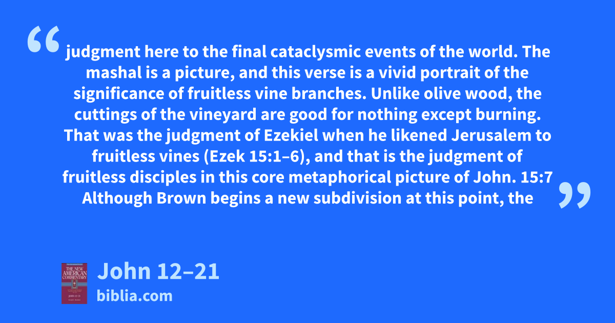 judgment here to the final cataclysmic events of the world. The mashal is a picture, and this verse is a vivid portrait of the significance of fruitless vine branches. Unlike olive wood, the cuttings of the vineyard are good for nothing except burning. That was the judgment of Ezekiel when he likened Jerusalem to fruitless vines (Ezek 15:1–6), and that is the judgment of fruitless disciples in this core metaphorical picture of John. 15:7 Although Brown begins a new subdivision at this point, the