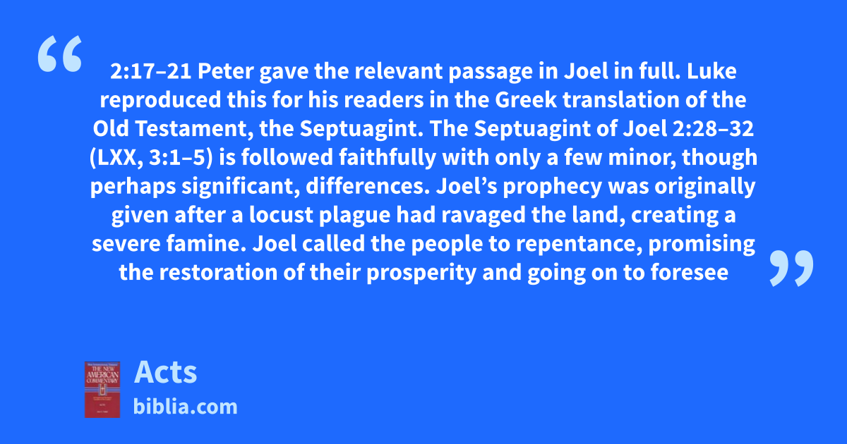 2:17–21 Peter gave the relevant passage in Joel in full. Luke reproduced this for his readers in the Greek translation of the Old Testament, the Septuagint. The Septuagint of Joel 2:28–32 (LXX, 3:1–5) is followed faithfully with only a few minor, though perhaps significant, differences. Joel’s prophecy was originally given after a locust plague had ravaged the land, creating a severe famine. Joel called the people to repentance, promising the restoration of their prosperity and going on to foresee