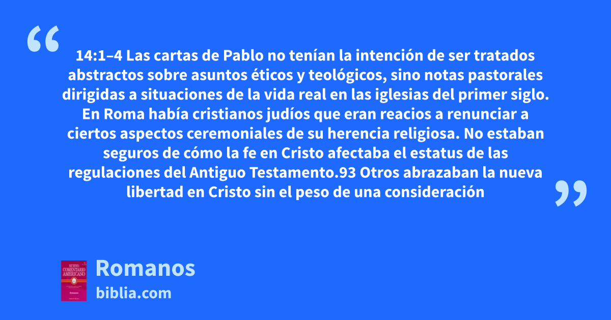 14:1–4 Las cartas de Pablo no tenían la intención de ser tratados abstractos sobre asuntos éticos y teológicos, sino notas pastorales dirigidas a situaciones de la vida real en las iglesias del primer siglo. En Roma había cristianos judíos que eran reacios a renunciar a ciertos aspectos ceremoniales de su herencia religiosa. No estaban seguros de cómo la fe en Cristo afectaba el estatus de las regulaciones del Antiguo Testamento.93 Otros abrazaban la nueva libertad en Cristo sin el peso de una consideración