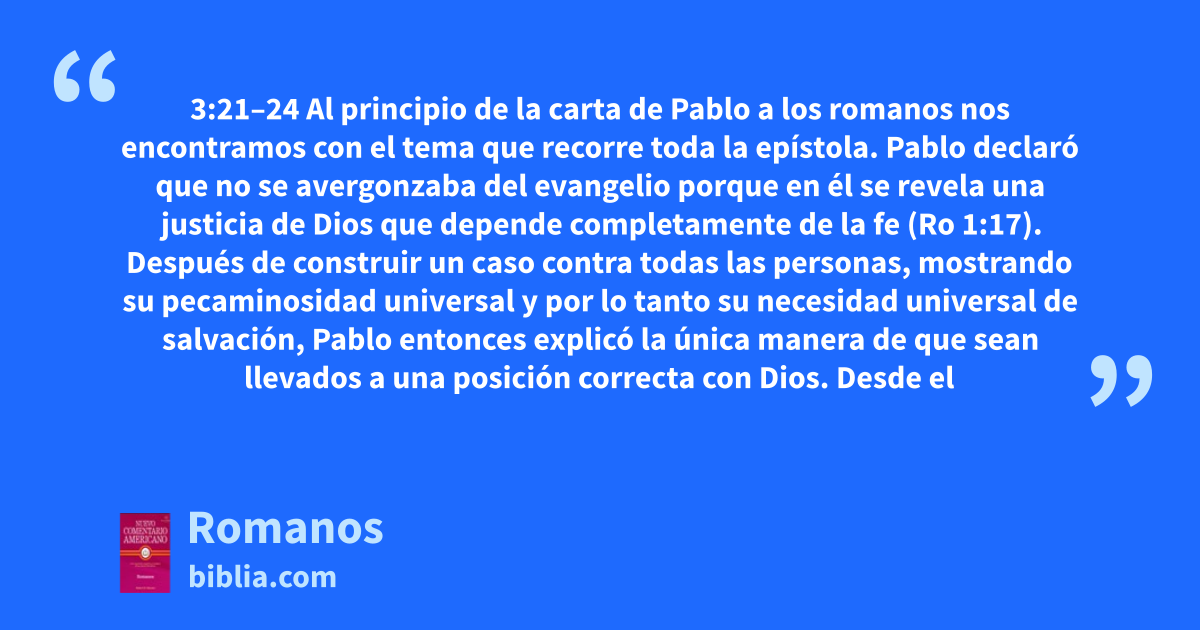 3:21–24 Al principio de la carta de Pablo a los romanos nos encontramos con el tema que recorre toda la epístola. Pablo declaró que no se avergonzaba del evangelio porque en él se revela una justicia de Dios que depende completamente de la fe (Ro 1:17). Después de construir un caso contra todas las personas, mostrando su pecaminosidad universal y por lo tanto su necesidad universal de salvación, Pablo entonces explicó la única manera de que sean llevados a una posición correcta con Dios. Desde el