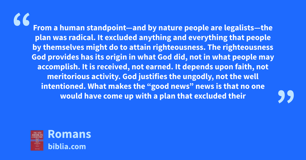 From a human standpoint—and by nature people are legalists—the plan was radical. It excluded anything and everything that people by themselves might do to attain righteousness. The righteousness God provides has its origin in what God did, not in what people may accomplish. It is received, not earned. It depends upon faith, not meritorious activity. God justifies the ungodly, not the well intentioned. What makes the “good news” news is that no one would have come up with a plan that excluded their
