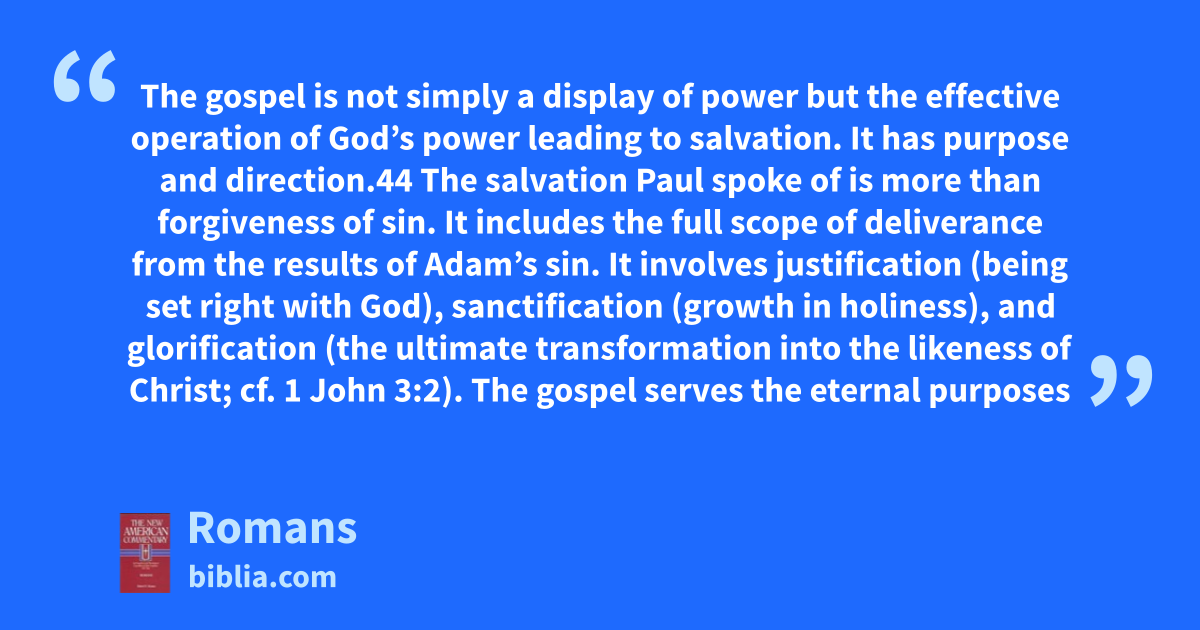 The gospel is not simply a display of power but the effective operation of God’s power leading to salvation. It has purpose and direction.44 The salvation Paul spoke of is more than forgiveness of sin. It includes the full scope of deliverance from the results of Adam’s sin. It involves justification (being set right with God), sanctification (growth in holiness), and glorification (the ultimate transformation into the likeness of Christ; cf. 1 John 3:2). The gospel serves the eternal purposes
