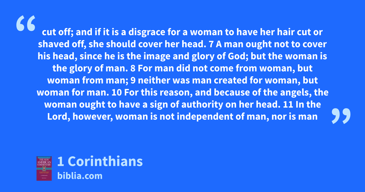 cut off; and if it is a disgrace for a woman to have her hair cut or shaved off, she should cover her head. 7 A man ought not to cover his head, since he is the image and glory of God; but the woman is the glory of man. 8 For man did not come from woman, but woman from man; 9 neither was man created for woman, but woman for man. 10 For this reason, and because of the angels, the woman ought to have a sign of authority on her head. 11 In the Lord, however, woman is not independent of man, nor is man