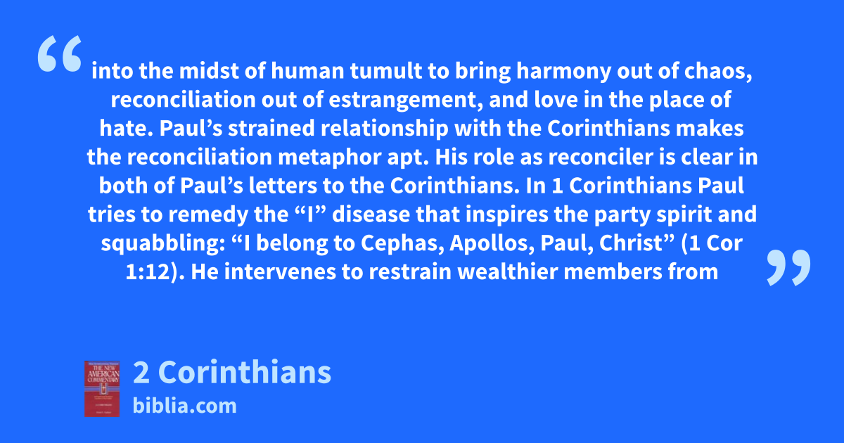 into the midst of human tumult to bring harmony out of chaos, reconciliation out of estrangement, and love in the place of hate. Paul’s strained relationship with the Corinthians makes the reconciliation metaphor apt. His role as reconciler is clear in both of Paul’s letters to the Corinthians. In 1 Corinthians Paul tries to remedy the “I” disease that inspires the party spirit and squabbling: “I belong to Cephas, Apollos, Paul, Christ” (1 Cor 1:12). He intervenes to restrain wealthier members from