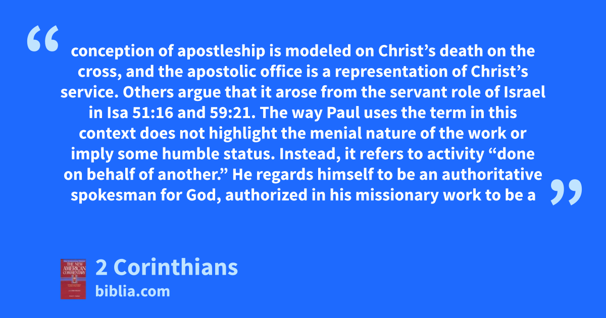 conception of apostleship is modeled on Christ’s death on the cross, and the apostolic office is a representation of Christ’s service. Others argue that it arose from the servant role of Israel in Isa 51:16 and 59:21. The way Paul uses the term in this context does not highlight the menial nature of the work or imply some humble status. Instead, it refers to activity “done on behalf of another.” He regards himself to be an authoritative spokesman for God, authorized in his missionary work to be a