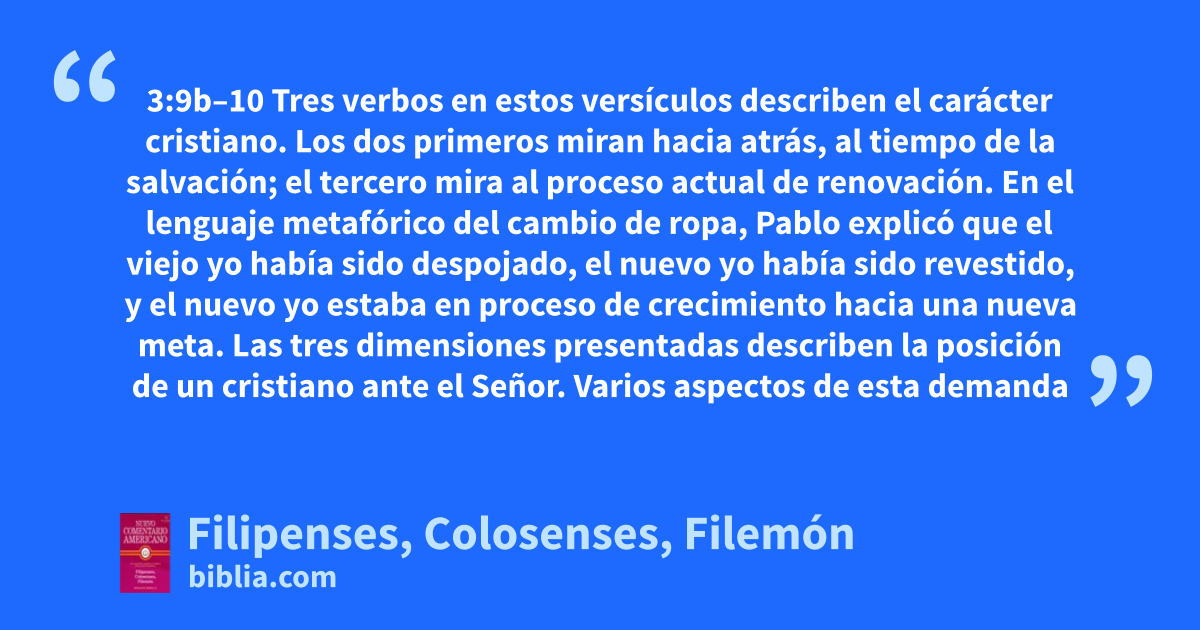 3:9b–10 Tres verbos en estos versículos describen el carácter cristiano. Los dos primeros miran hacia atrás, al tiempo de la salvación; el tercero mira al proceso actual de renovación. En el lenguaje metafórico del cambio de ropa, Pablo explicó que el viejo yo había sido despojado, el nuevo yo había sido revestido, y el nuevo yo estaba en proceso de crecimiento hacia una nueva meta. Las tres dimensiones presentadas describen la posición de un cristiano ante el Señor. Varios aspectos de esta demanda