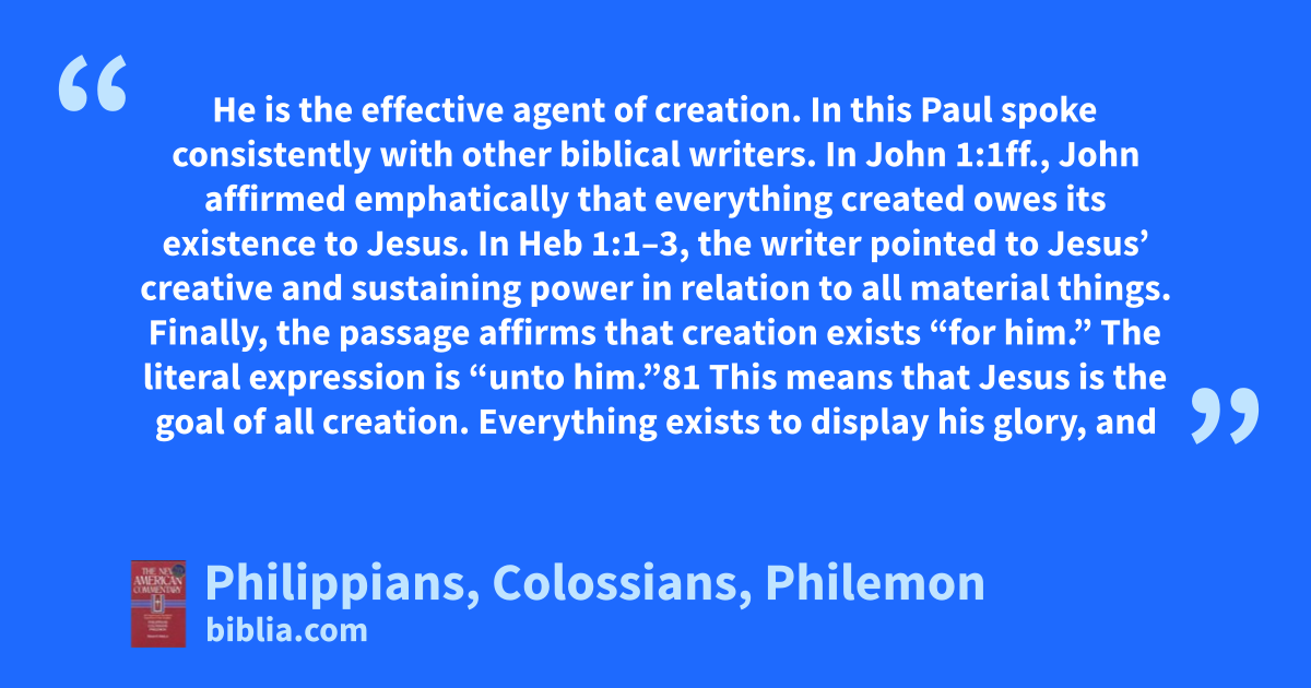 He is the effective agent of creation. In this Paul spoke consistently with other biblical writers. In John 1:1ff., John affirmed emphatically that everything created owes its existence to Jesus. In Heb 1:1–3, the writer pointed to Jesus’ creative and sustaining power in relation to all material things. Finally, the passage affirms that creation exists “for him.” The literal expression is “unto him.”81 This means that Jesus is the goal of all creation. Everything exists to display his glory, and