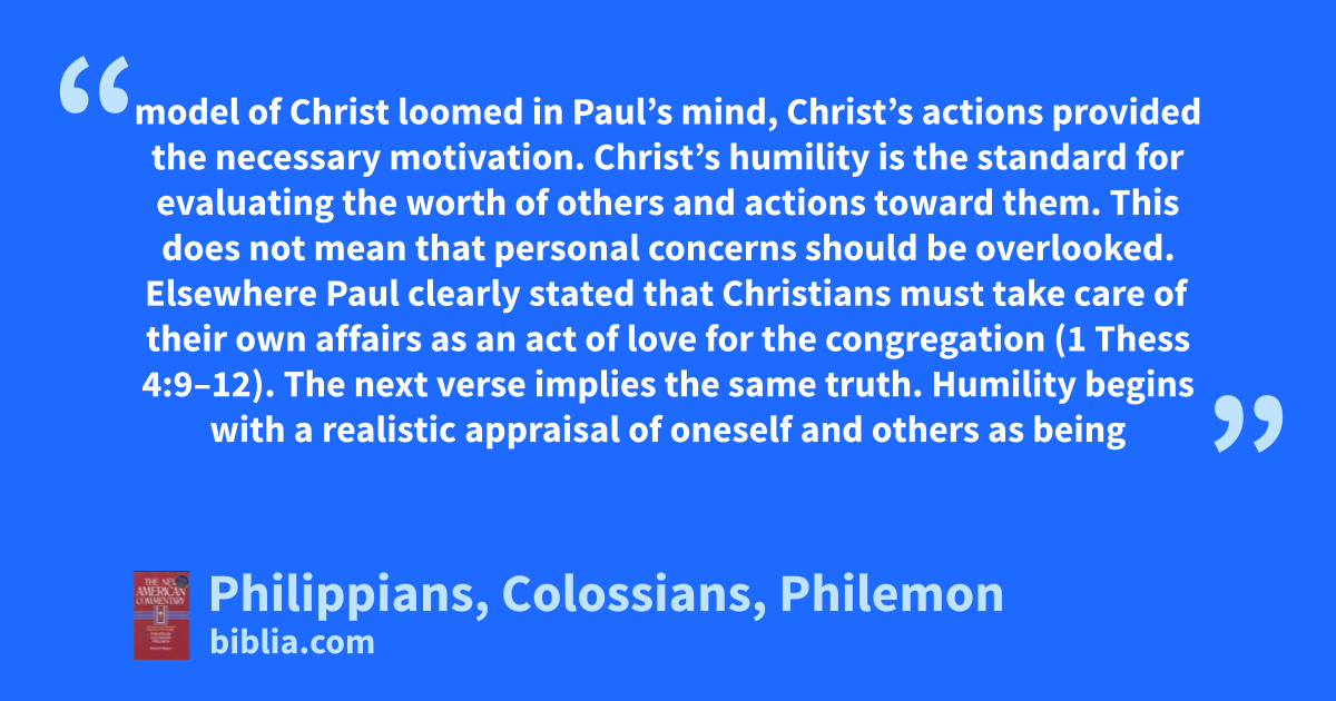 model of Christ loomed in Paul’s mind, Christ’s actions provided the necessary motivation. Christ’s humility is the standard for evaluating the worth of others and actions toward them. This does not mean that personal concerns should be overlooked. Elsewhere Paul clearly stated that Christians must take care of their own affairs as an act of love for the congregation (1 Thess 4:9–12). The next verse implies the same truth. Humility begins with a realistic appraisal of oneself and others as being