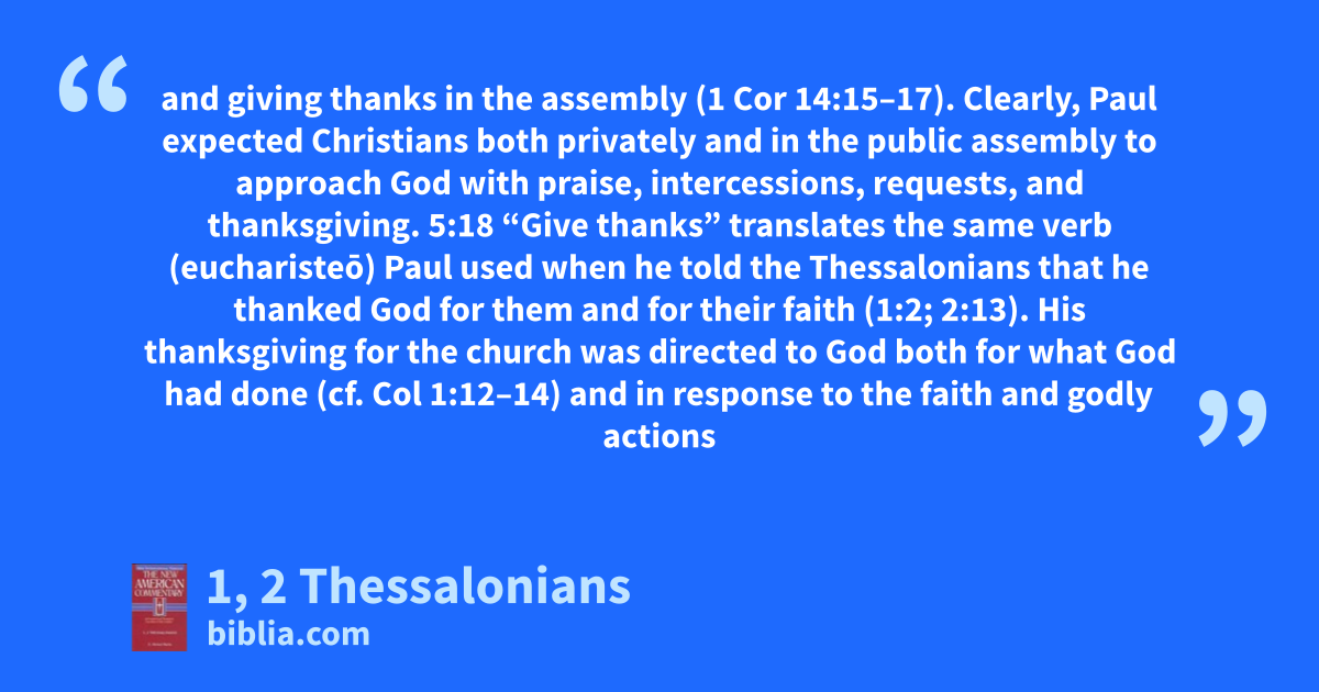 and giving thanks in the assembly (1 Cor 14:15–17). Clearly, Paul expected Christians both privately and in the public assembly to approach God with praise, intercessions, requests, and thanksgiving. 5:18 “Give thanks” translates the same verb (eucharisteō) Paul used when he told the Thessalonians that he thanked God for them and for their faith (1:2; 2:13). His thanksgiving for the church was directed to God both for what God had done (cf. Col 1:12–14) and in response to the faith and godly actions