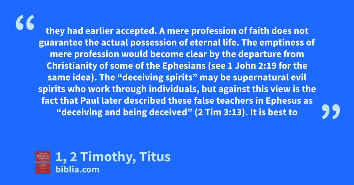 they had earlier accepted. A mere profession of faith does not guarantee the actual possession of eternal life. The emptiness of mere profession would become clear by the departure from Christianity of some of the Ephesians (see 1 John 2:19 for the same idea). The “deceiving spirits” may be supernatural evil spirits who work through individuals, but against this view is the fact that Paul later described these false teachers in Ephesus as “deceiving and being deceived” (2 Tim 3:13). It is best to