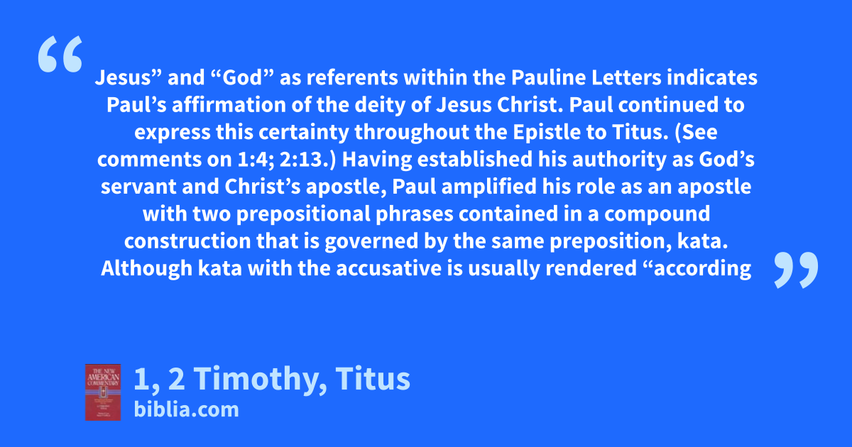 Jesus” and “God” as referents within the Pauline Letters indicates Paul’s affirmation of the deity of Jesus Christ. Paul continued to express this certainty throughout the Epistle to Titus. (See comments on 1:4; 2:13.) Having established his authority as God’s servant and Christ’s apostle, Paul amplified his role as an apostle with two prepositional phrases contained in a compound construction that is governed by the same preposition, kata. Although kata with the accusative is usually rendered “according
