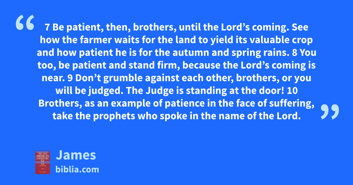 7 Be patient, then, brothers, until the Lord’s coming. See how the farmer waits for the land to yield its valuable crop and how patient he is for the autumn and spring rains. 8 You too, be patient and stand firm, because the Lord’s coming is near. 9 Don’t grumble against each other, brothers, or you will be judged. The Judge is standing at the door! 10 Brothers, as an example of patience in the face of suffering, take the prophets who spoke in the name of the Lord.
