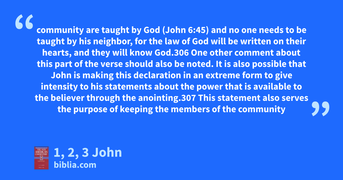community are taught by God (John 6:45) and no one needs to be taught by his neighbor, for the law of God will be written on their hearts, and they will know God.306 One other comment about this part of the verse should also be noted. It is also possible that John is making this declaration in an extreme form to give intensity to his statements about the power that is available to the believer through the anointing.307 This statement also serves the purpose of keeping the members of the community