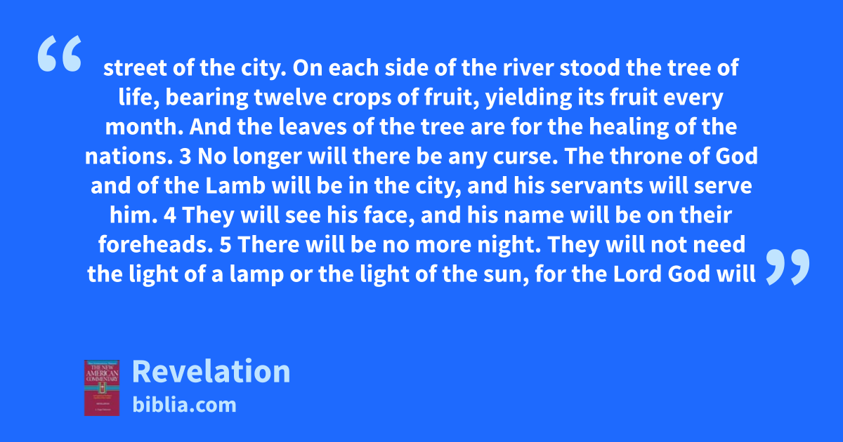 street of the city. On each side of the river stood the tree of life, bearing twelve crops of fruit, yielding its fruit every month. And the leaves of the tree are for the healing of the nations. 3 No longer will there be any curse. The throne of God and of the Lamb will be in the city, and his servants will serve him. 4 They will see his face, and his name will be on their foreheads. 5 There will be no more night. They will not need the light of a lamp or the light of the sun, for the Lord God will