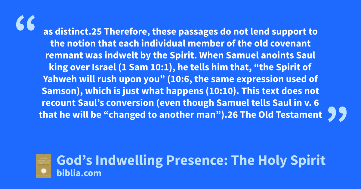 as distinct.25 Therefore, these passages do not lend support to the notion that each individual member of the old covenant remnant was indwelt by the Spirit. When Samuel anoints Saul king over Israel (1 Sam 10:1), he tells him that, “the Spirit of Yahweh will rush upon you” (10:6, the same expression used of Samson), which is just what happens (10:10). This text does not recount Saul’s conversion (even though Samuel tells Saul in v. 6 that he will be “changed to another man”).26 The Old Testament