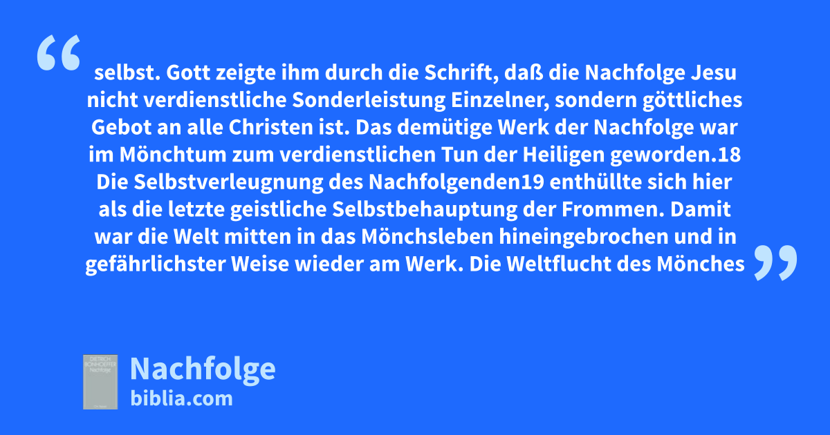 selbst. Gott zeigte ihm durch die Schrift, daß die Nachfolge Jesu nicht verdienstliche Sonderleistung Einzelner, sondern göttliches Gebot an alle Christen ist. Das demütige Werk der Nachfolge war im Mönchtum zum verdienstlichen Tun der Heiligen geworden.18 Die Selbstverleugnung des Nachfolgenden19 enthüllte sich hier als die letzte geistliche Selbstbehauptung der Frommen. Damit war die Welt mitten in das Mönchsleben hineingebrochen und in gefährlichster Weise wieder am Werk. Die Weltflucht des Mönches