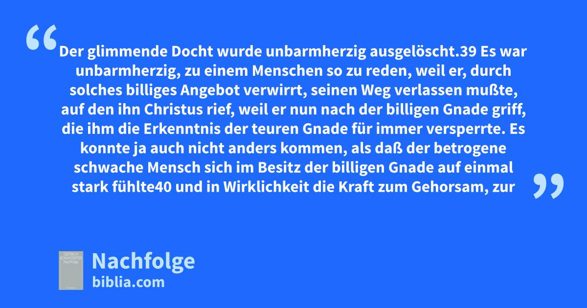 Der glimmende Docht wurde unbarmherzig ausgelöscht.39 Es war unbarmherzig, zu einem Menschen so zu reden, weil er, durch solches billiges Angebot verwirrt, seinen Weg verlassen mußte, auf den ihn Christus rief, weil er nun nach der billigen Gnade griff, die ihm die Erkenntnis der teuren Gnade für immer versperrte. Es konnte ja auch nicht anders kommen, als daß der betrogene schwache Mensch sich im Besitz der billigen Gnade auf einmal stark fühlte40 und in Wirklichkeit die Kraft zum Gehorsam, zur