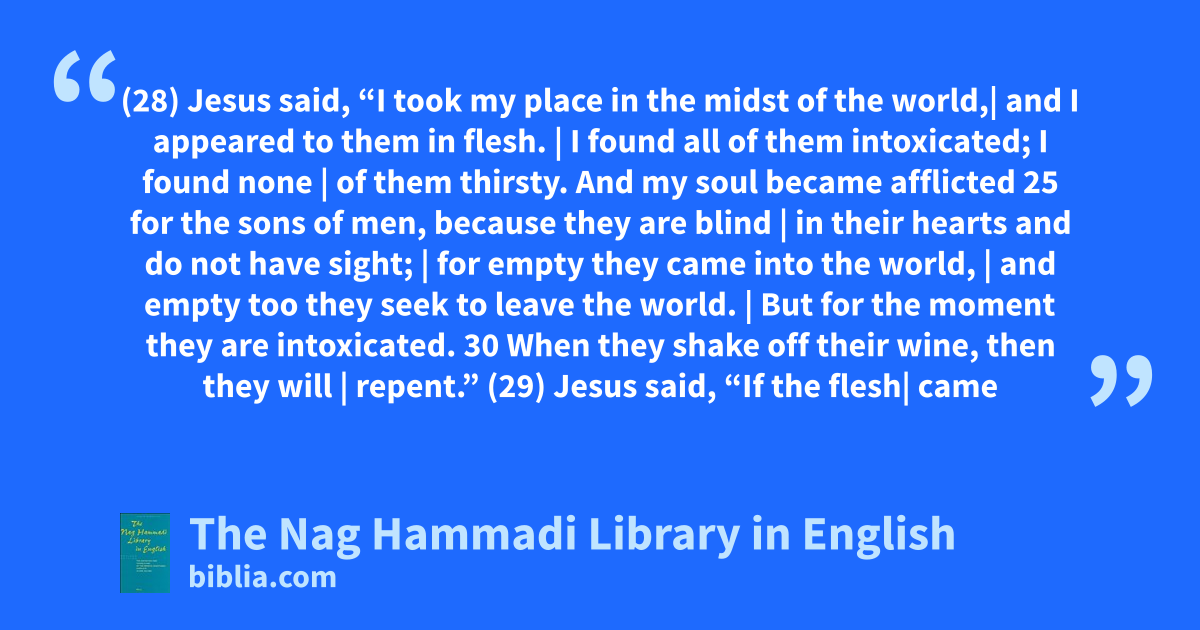 (28) Jesus said, “I took my place in the midst of the world,| and I appeared to them in flesh. | I found all of them intoxicated; I found none | of them thirsty. And my soul became afflicted 25 for the sons of men, because they are blind | in their hearts and do not have sight; | for empty they came into the world, | and empty too they seek to leave the world. | But for the moment they are intoxicated. 30 When they shake off their wine, then they will | repent.” (29) Jesus said, “If the flesh| came