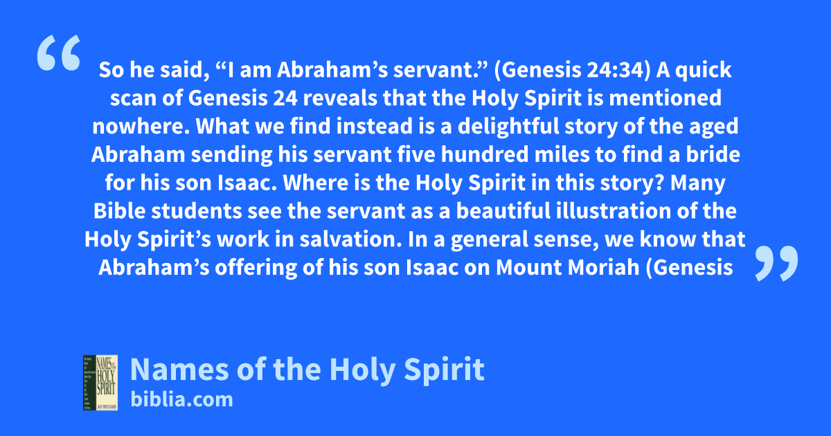 So he said, “I am Abraham’s servant.” (Genesis 24:34) A quick scan of Genesis 24 reveals that the Holy Spirit is mentioned nowhere. What we find instead is a delightful story of the aged Abraham sending his servant five hundred miles to find a bride for his son Isaac. Where is the Holy Spirit in this story? Many Bible students see the servant as a beautiful illustration of the Holy Spirit’s work in salvation. In a general sense, we know that Abraham’s offering of his son Isaac on Mount Moriah (Genesis
