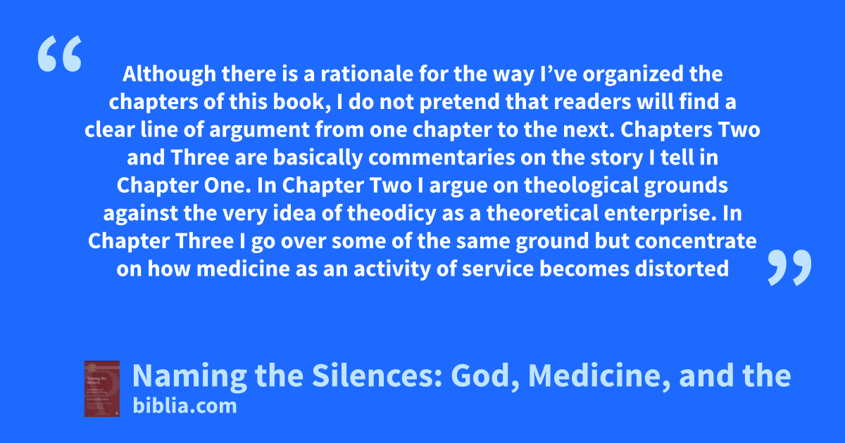 Although there is a rationale for the way I’ve organized the chapters of this book, I do not pretend that readers will find a clear line of argument from one chapter to the next. Chapters Two and Three are basically commentaries on the story I tell in Chapter One. In Chapter Two I argue on theological grounds against the very idea of theodicy as a theoretical enterprise. In Chapter Three I go over some of the same ground but concentrate on how medicine as an activity of service becomes distorted