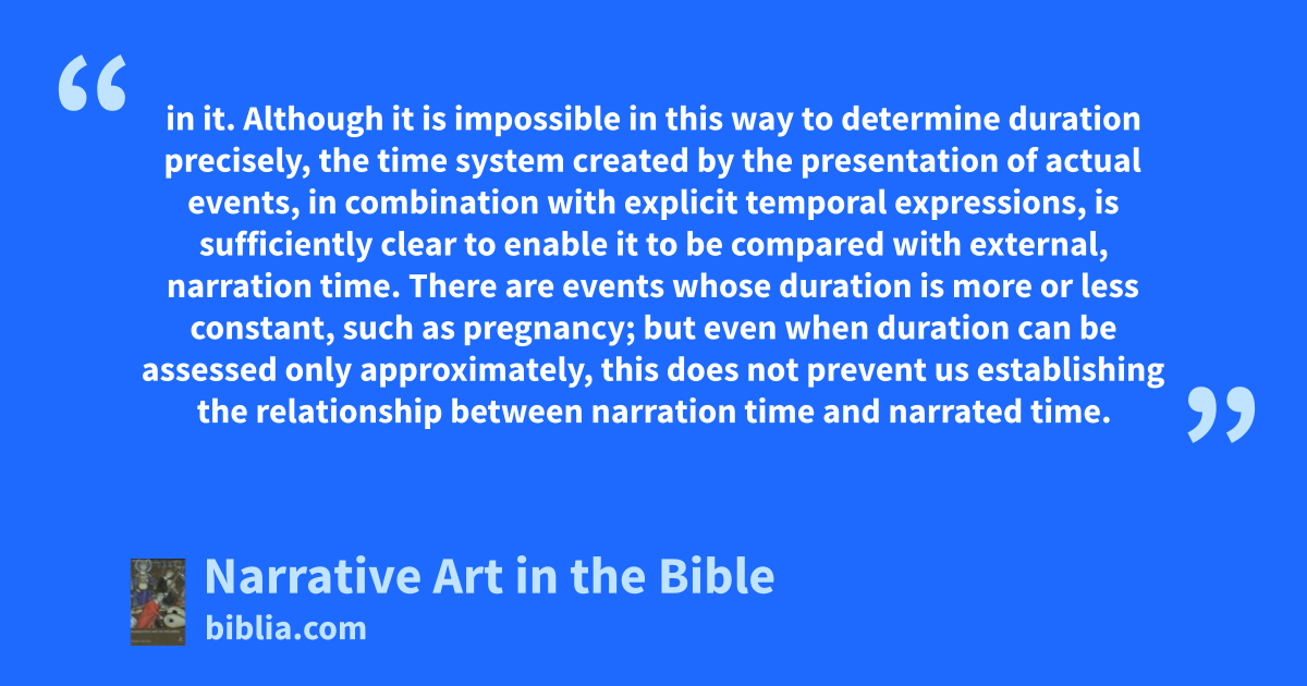 in it. Although it is impossible in this way to determine duration precisely, the time system created by the presentation of actual events, in combination with explicit temporal expressions, is sufficiently clear to enable it to be compared with external, narration time. There are events whose duration is more or less constant, such as pregnancy; but even when duration can be assessed only approximately, this does not prevent us establishing the relationship between narration time and narrated time.