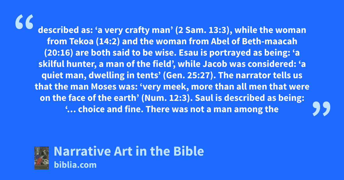 described as: ‘a very crafty man’ (2 Sam. 13:3), while the woman from Tekoa (14:2) and the woman from Abel of Beth-maacah (20:16) are both said to be wise. Esau is portrayed as being: ‘a skilful hunter, a man of the field’, while Jacob was considered: ‘a quiet man, dwelling in tents’ (Gen. 25:27). The narrator tells us that the man Moses was: ‘very meek, more than all men that were on the face of the earth’ (Num. 12:3). Saul is described as being: ‘… choice and fine. There was not a man among the