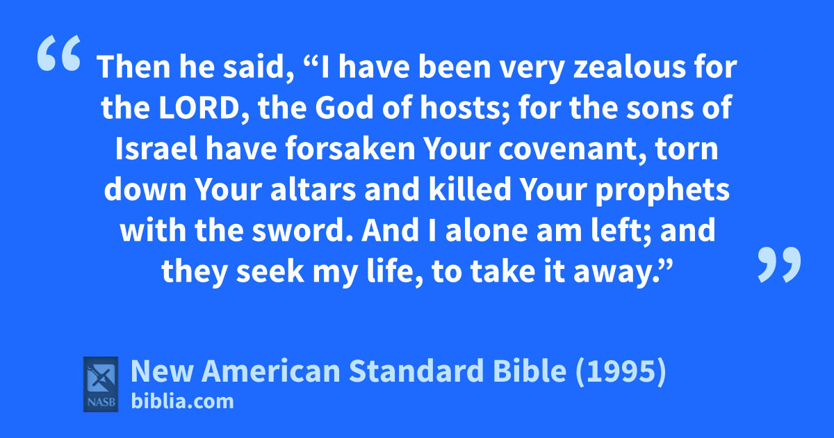 14 Then he said, “aI have been very zealous for the Lord, the God of hosts; for the sons of Israel have forsaken Your covenant, torn down Your altars and killed Your prophets with the sword. And I alone am left; and they seek my life, to take it away.”