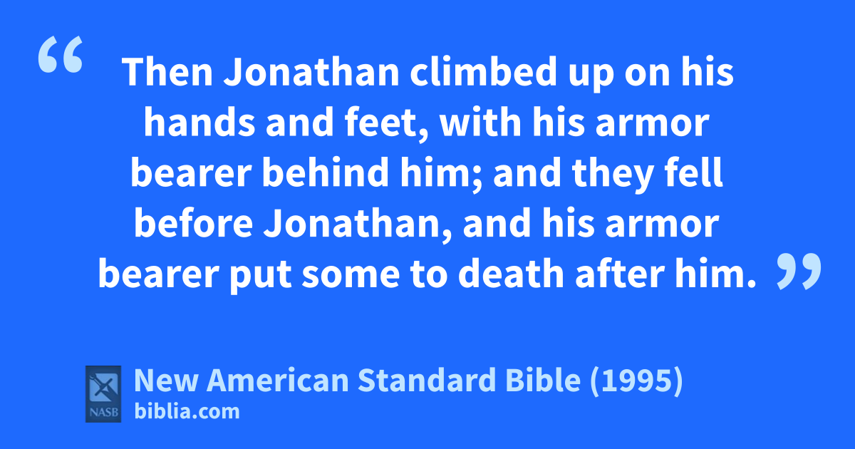 13 Then Jonathan climbed up on his hands and feet, with his armor bearer behind him; and they fell before Jonathan, and his armor bearer put some to death after him.