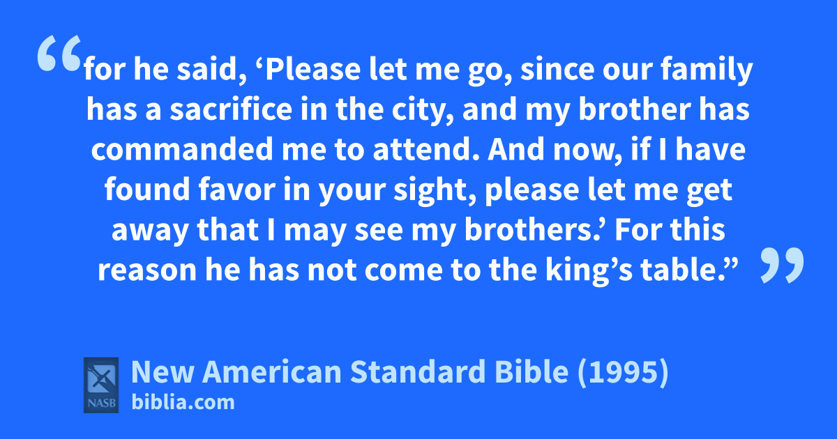 29 for he said, ‘Please 1let me go, since our family has a sacrifice in the city, and my brother has commanded me to attend. And now, if I have found favor in your sight, please let me get away that I may see my brothers.’ For this reason he has not come to the king’s table.”