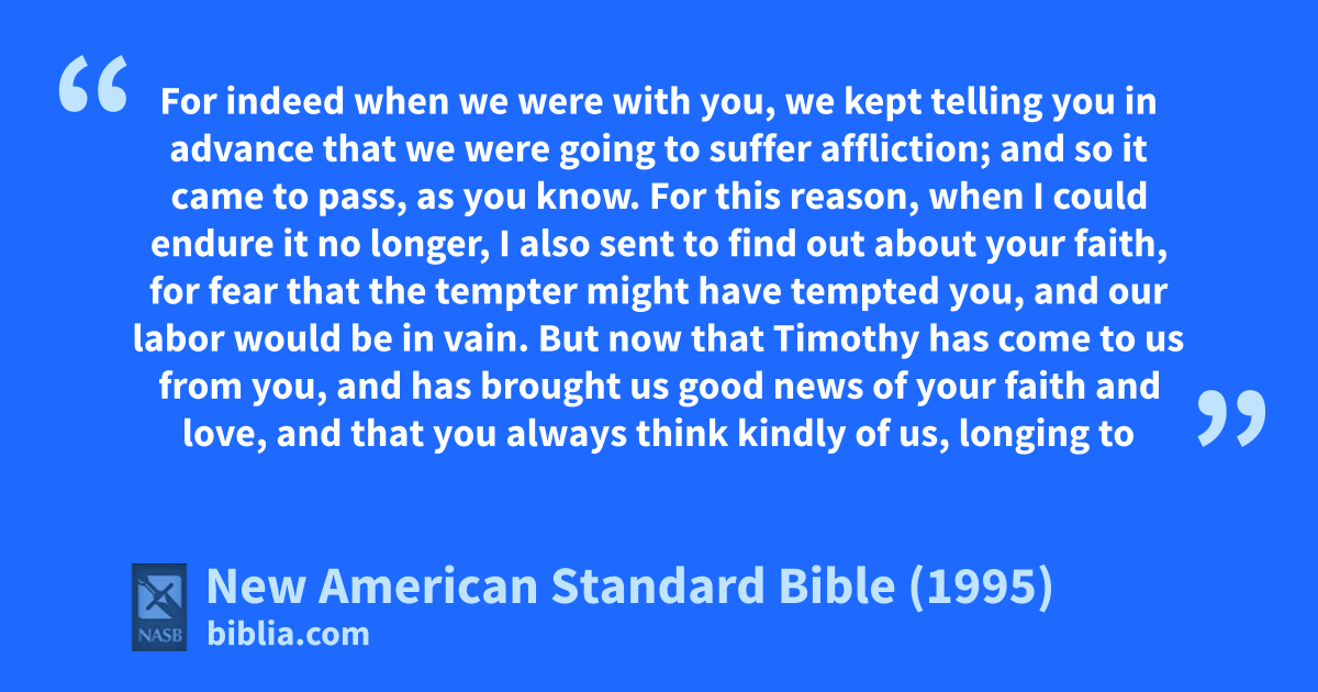 6 But now that aTimothy has come to us from you, and has brought us good news of byour faith and love, and that you always cthink kindly of us, longing to see us just as we also long to see you,