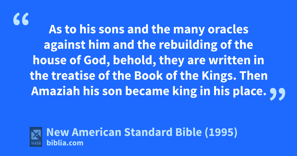27 As to his sons and the many 1oracles against him and athe 2rebuilding of the house of God, behold, they are written in the 3btreatise of the Book of the Kings. Then Amaziah his son became king in his place.