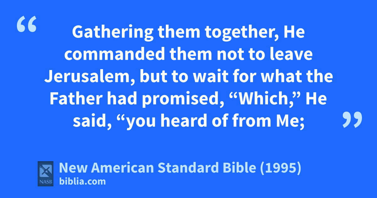 4 1Gathering them together, He commanded them anot to leave Jerusalem, but to wait for 2bwhat the Father had promised, “Which,” He said, “you heard of from Me;