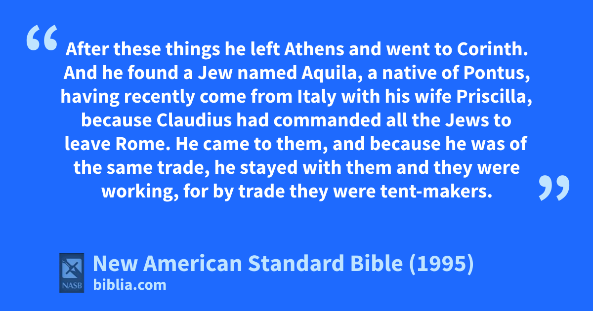 2 And he found a Jew named aAquila, a native of bPontus, having recently come from cItaly with his wife aPriscilla, because dClaudius had commanded all the Jews to leave Rome. He came to them,