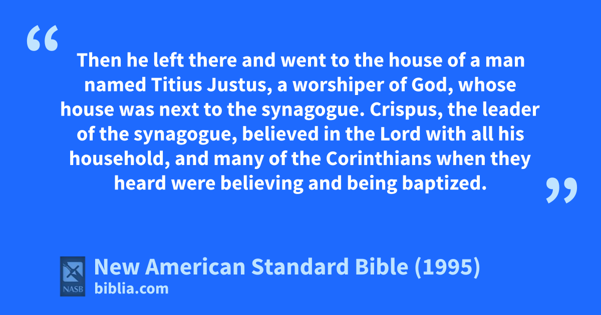 8 aCrispus, bthe leader of the synagogue, believed in the Lord cwith all his household, and many of the dCorinthians when they heard were believing and being baptized.