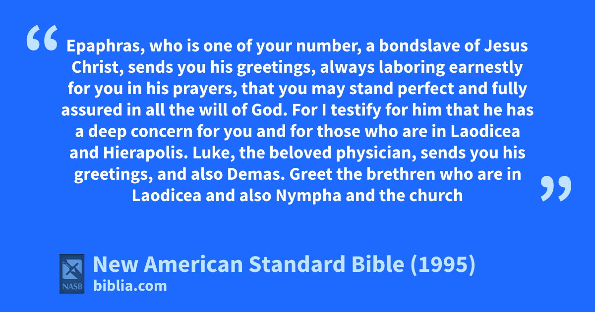 12 aEpaphras, bwho is one of your number, a bondslave of Jesus Christ, sends you his greetings, always claboring earnestly for you in his prayers, that you may 1stand 2dperfect and 3fully assured in all the will of God.