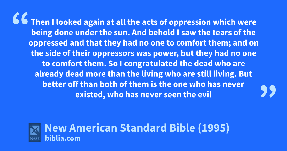 1 Then I looked again at all the acts of aoppression which were being done under the sun. And behold I saw the tears of the oppressed and that they had bno one to comfort them; and on the side of their oppressors was power, but they had no one to comfort them.