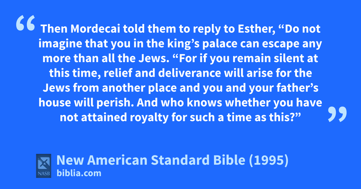 14 “For if you remain silent at this time, relief and adeliverance will arise for the Jews from another place and you and your father’s house will perish. And who knows whether you have not attained royalty for such a time as this?”