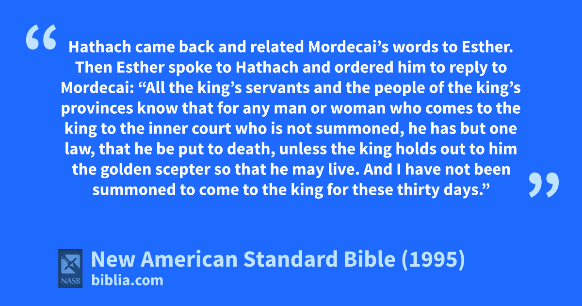 11 “All the king’s servants and the people of the king’s provinces know that for any man or woman who acomes to the king to the inner court who is not summoned, bhe has but one law, that he be put to death, unless the king holds out cto him the golden scepter so that he may live. And I have not been summoned to come to the king for these thirty days.”