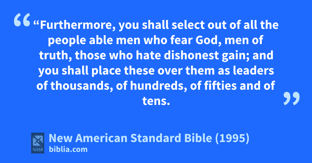 21 “Furthermore, you shall 1select out of all the people aable men bwho fear God, men of truth, those who chate dishonest gain; and you shall place these over them as leaders of thousands, 2of hundreds, 2of fifties and 2of tens.